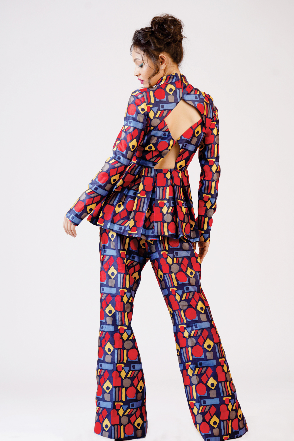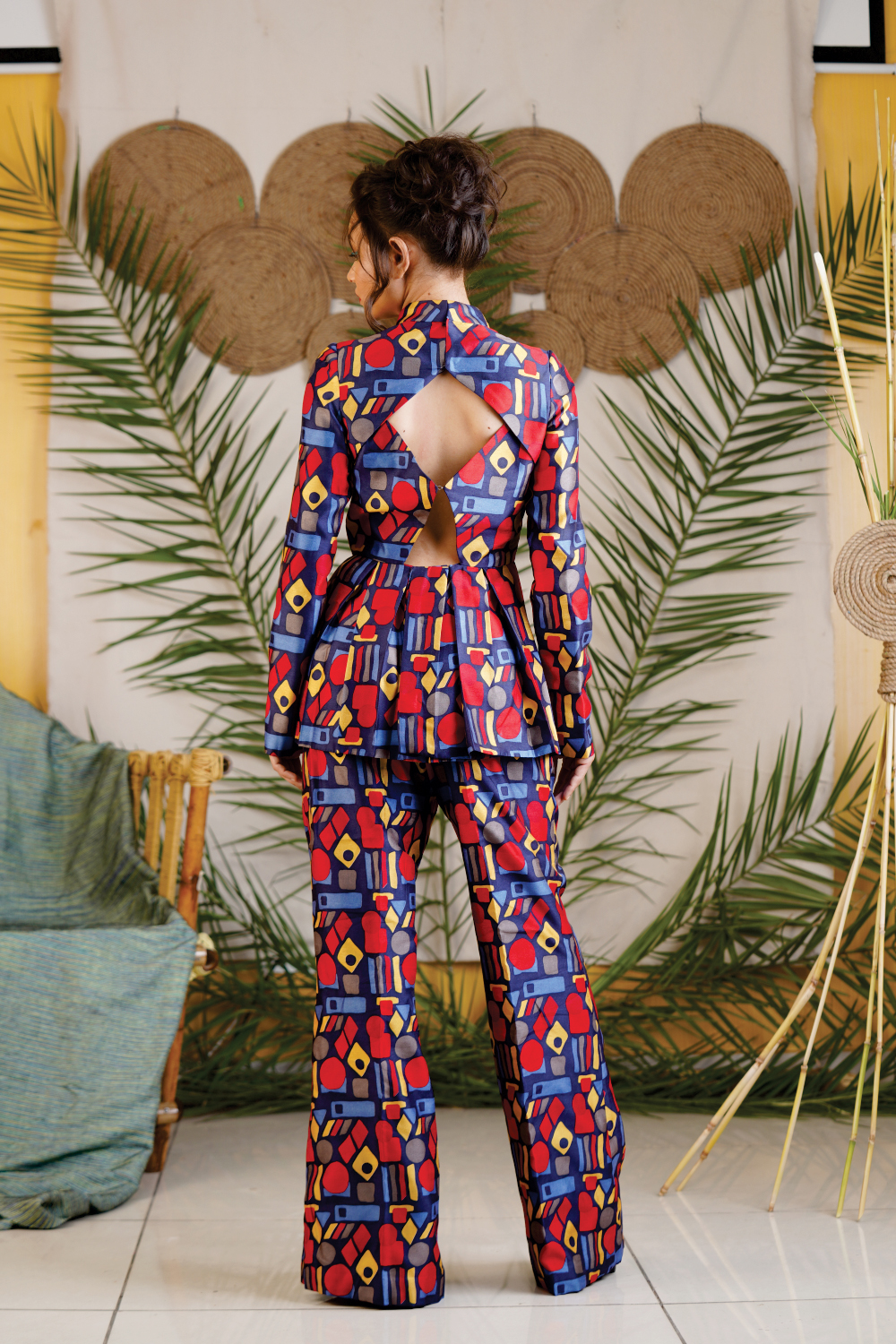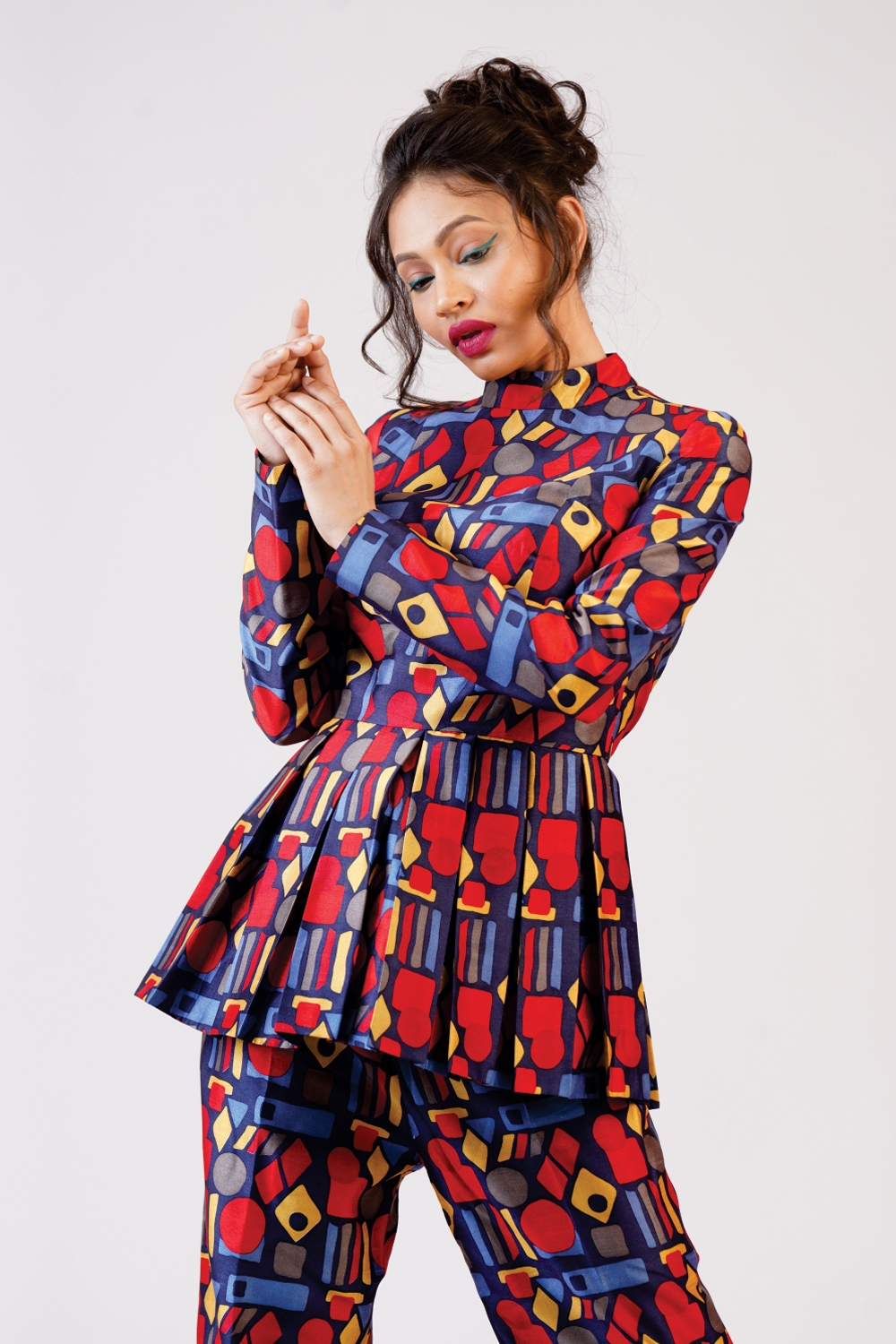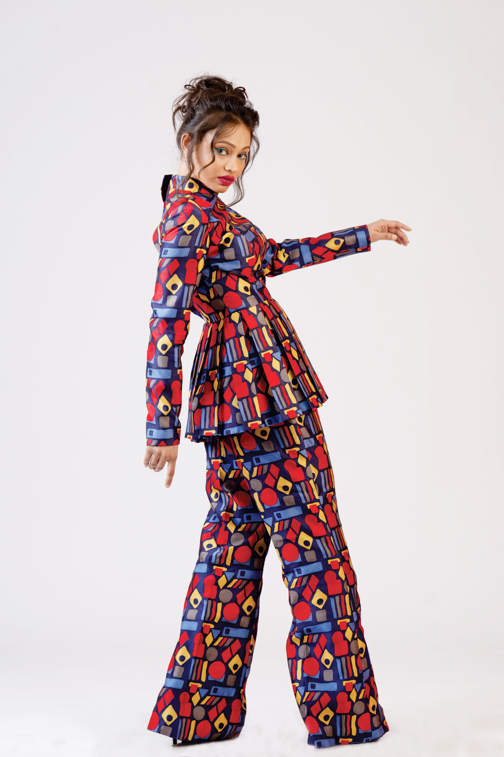 Creative corporate Jacket shirt with pleated waist attachment added with flaired trouser