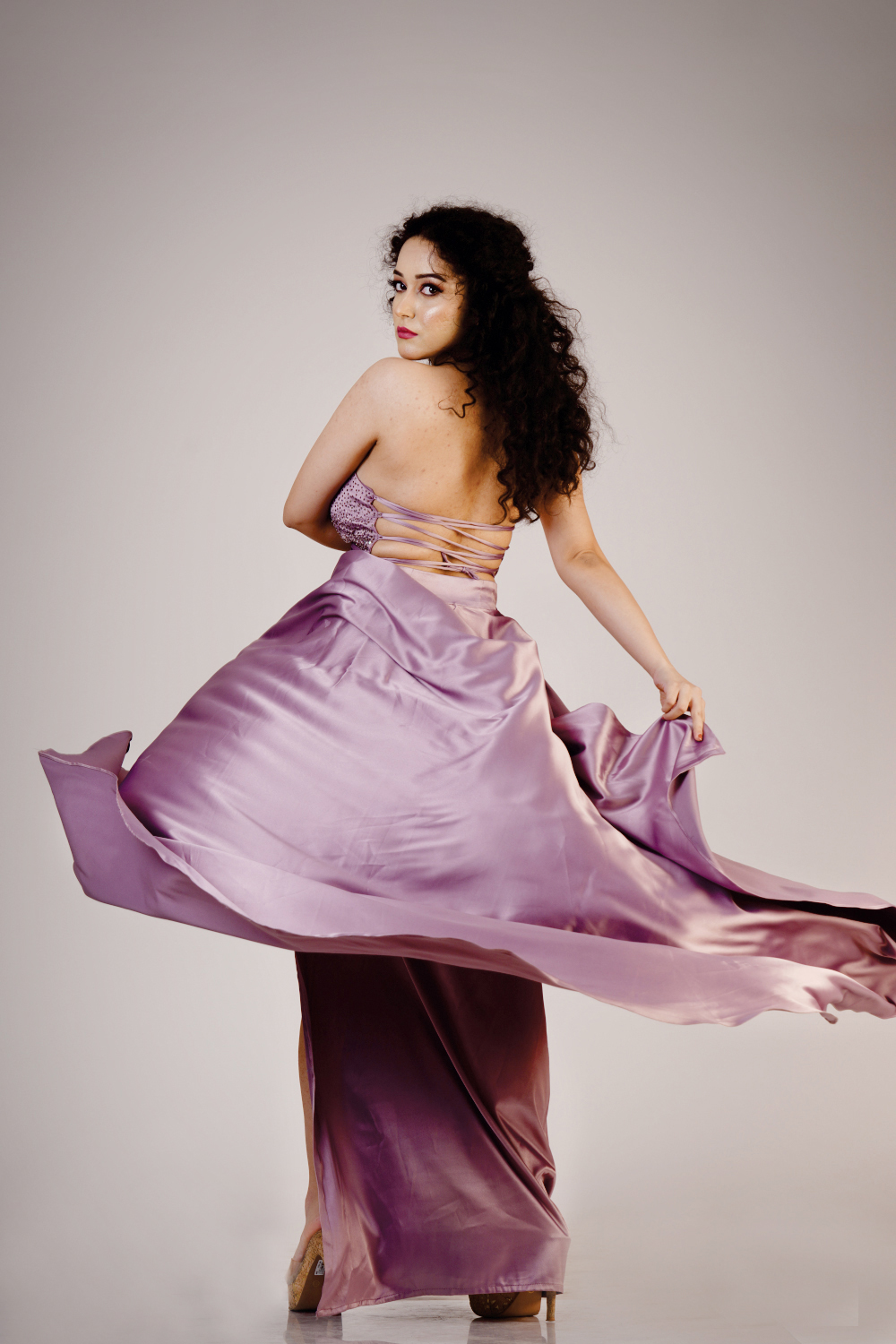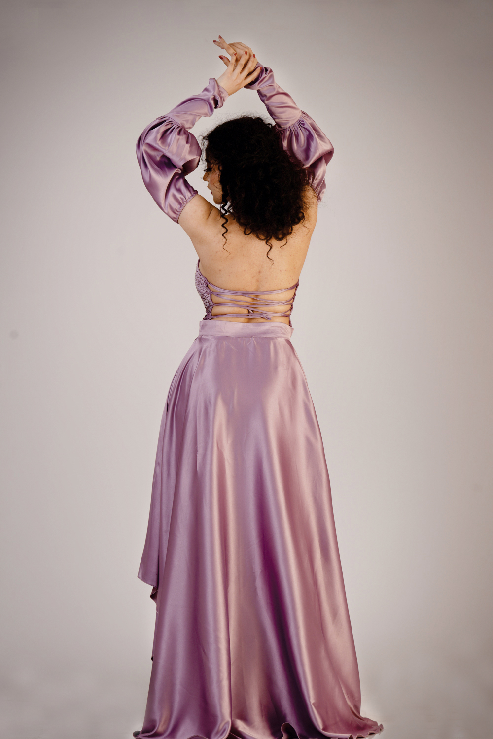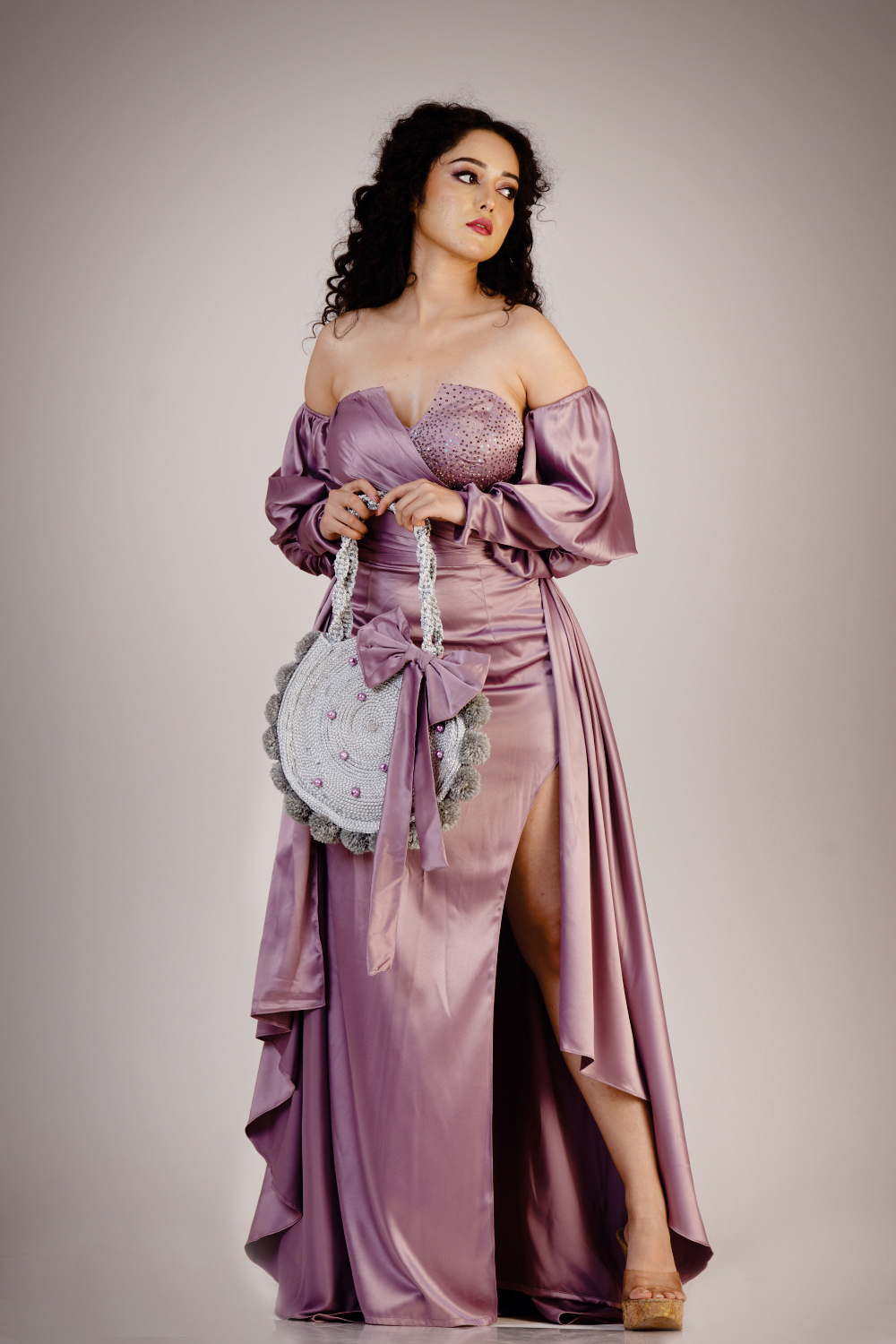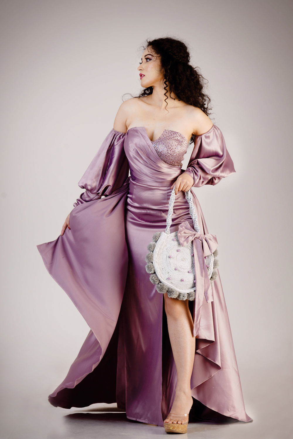 Strapless slit gown added with bell sleeve